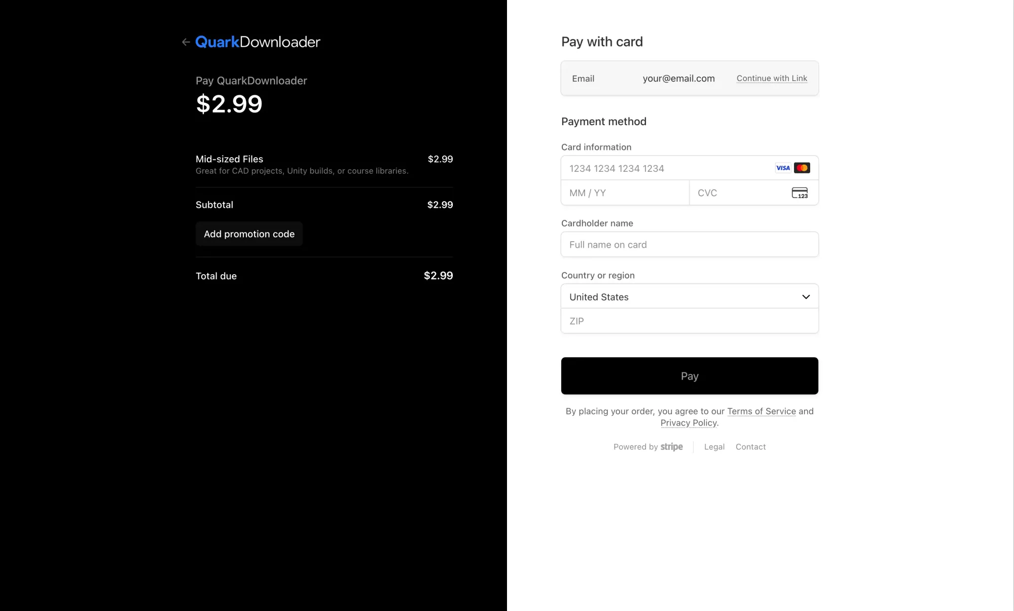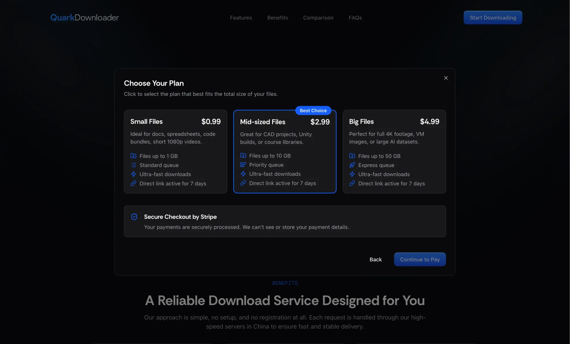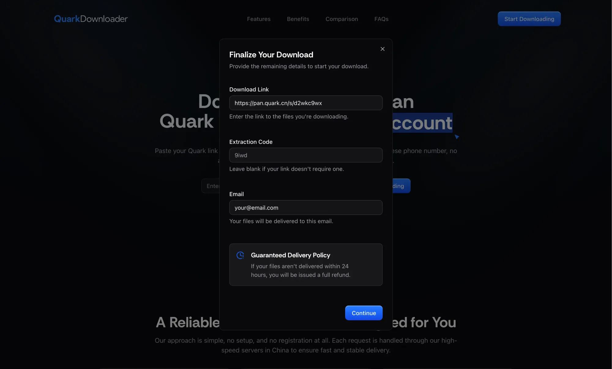 QuarkDownloader is minimal and easy to use. There are no accounts, dashboards, or complex settings. You just paste your Pan Quark link, choose a plan, and get your download delivered by email.